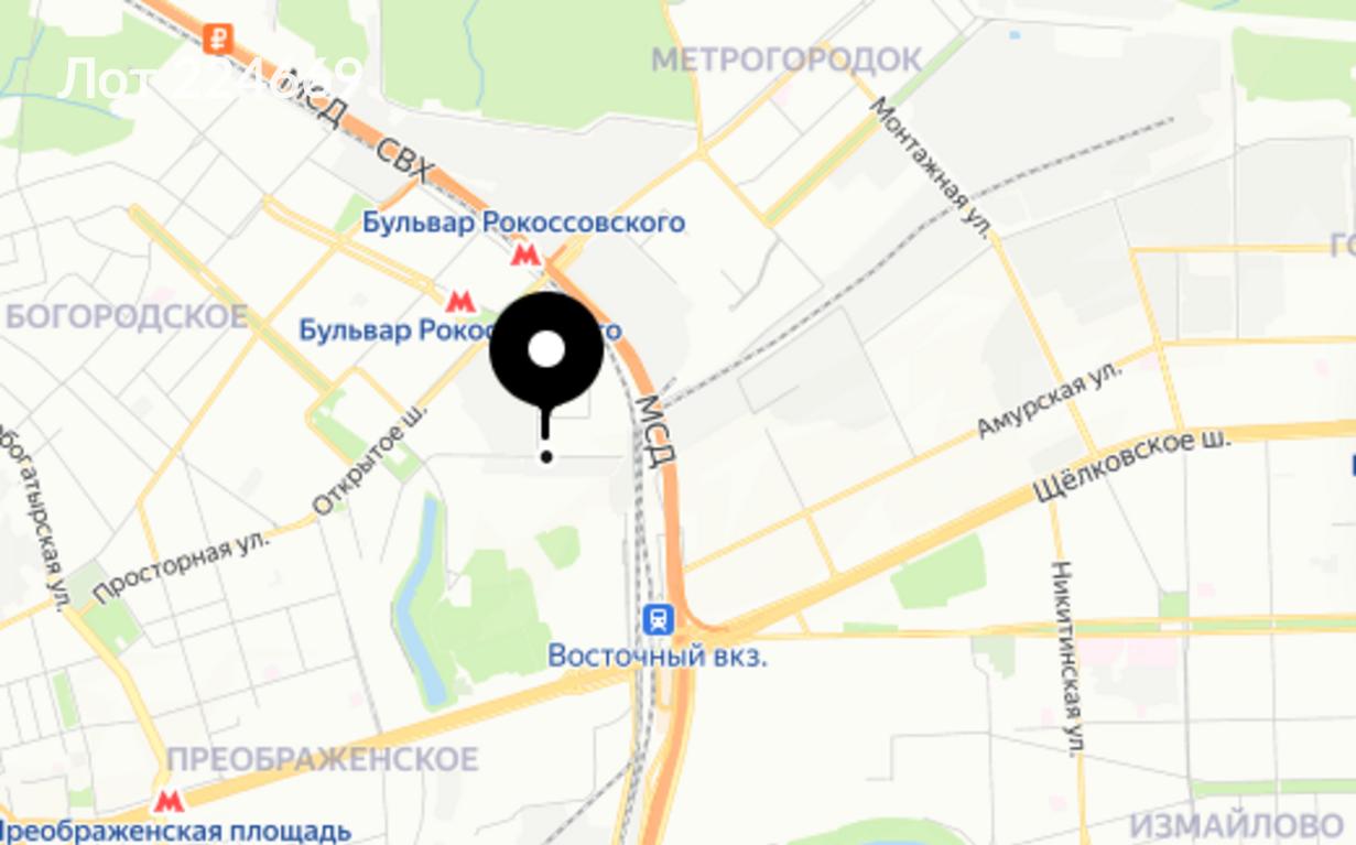 Лот № 224669 Предлагается в аренду помещение, расположенное на втором этаже с отдельным входом со стороны нового жилого комплекса. Общая площадь: 680 м². Помещение имеет открытую планировку, позволяющую организовать пространство в соответствии с потребностями арендатора. Расстояние до станции метро "Бульвар Рокоссовского" составляет 5 минут пешком, до Северо-Восточной хорды (СВХ) – 2 минуты.